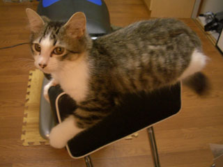 ロッソは、うちに来たときから、椅子の背もたれの狭い部分に座るのが大好き。